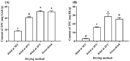 Contents of TPC (A) and TFC (B) in olive leaves after drying in an oven at 70 and 45 °C, room temperature (25 °C) and freeze dryer, respectively. Values are the mean of triplicate experiments, and the error bar indicates the standard error of duplicate data. Significance data were obtained by analysis of variance (ANOVA). Different lowercase letters (a, b, c and d) on the top of columns represent significant difference (p < 0.05).