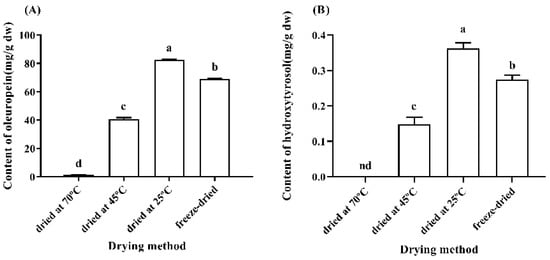 Contents of oleuropein (A) and hydroxytyrosol (B) in olive leaves after drying in an oven at 70 and 45 °C, room temperature (25 °C) and freeze dryer, respectively. Values are the mean of triplicate experiments and the error bar indicate the standard error of duplicate data. “nd” means “not detected”. Significance data were obtained by analysis of variance (ANOVA). Different lowercase letters (a, b, c and d) on the top of columns represent significant difference (p < 0.05).