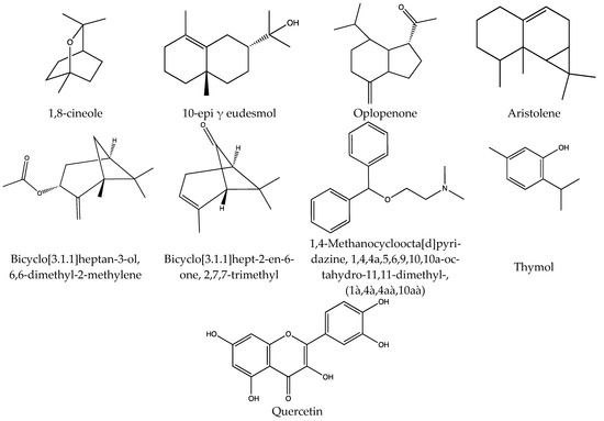 Eucalyptol (1,8-cineole) was the main compound identified in Turnera diffusa essential oils, in concentrations up to 17.20%. This compound is a cyclic-ether monoterpene also found in several plants such as eucalyptus, rosemary, sage, bay, cinnamon, and tea [65]. In addition, this compound has been reported for its pharmacological properties, including analgesic [66], insecticidal [67], sedative [68], antioxidant [69], anti-inflammatory [70,71], bactericidal [72], fungicidal [73], hypolipidemic [74], and anticancer activities [75]. Another very important compound in various areas is thymol, which is a volatile compound that widely exists in the essential oils of thyme and oregano plants. It is classified as a generally recognized as safe (GRAS) compound by the US Food and Drug Administration. It possesses notable antimicrobial activities against bacteria and fungi [76], and is used in edible films [77] and other areas. In phenolic compounds, the main identified compound was quercetin (Figure 1). It is a flavonoid detected in fruits, vegetables [78], and more than 20 plants that have been traditionally suggested for their analgesic, antispasmodic, and antidiabetic properties, and for treatment of iron deficiency and many other disorders [79]. In addition, anti-inflammatory, antihypertensive, vasodilator, antiobesity, antihypercholesterolemic and antiatherosclerotic functions of this substance have been reported [80,81].