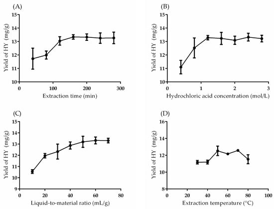 The effects of four single factors on the yield of HT. (A) Extraction time, (B) hydrochloric acid concentration, (C) liquid-to-material ratio and (D) extraction temperature.