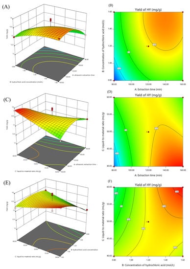 The 3D (A) and contour plots (B) of the interaction between extraction time and concentration of hydrochloric acid. The 3D (C) and contour plots (D) of the interaction between extraction time and liquid-to-material ratio. The 3D (E) and contour plots (F) of the interaction between concentration of hydrochloric acid and liquid-to-material ratio.