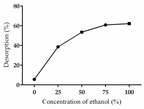 In order to investigate the effect of ethanol concentration on the desorption ability, static adsorption and desorption experiments were performed. Resin (1 g) was placed in conical flasks with 30 mL of sample solution and placed in a shaker for 24 h. The HT content in the supernatant was measured. Then, the resin was dried with filter paper after the solution was removed. A total of 30 mL of 0, 25, 50, 75 and 100% ethanol was added into the flasks and then the flasks were put in a shaker for another 24 h at 25 °C. The content of HT in the supernatant was measured.