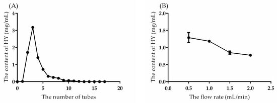 (A) The elution rate and (B) the effect of flow rate on the content of HT. Note: number of tubes meant the elution solution was collected in a 5 mL tube and the content of HY in each tube was determined.
