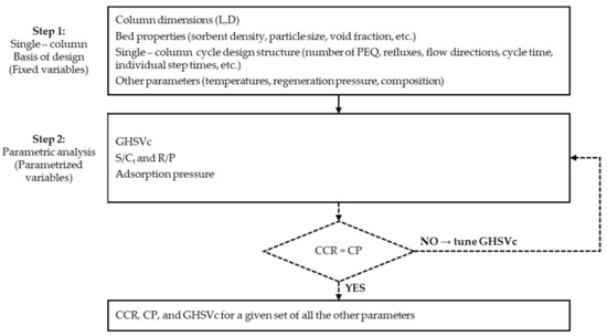 Systematic parametric approach that is devised for this work. Column dimensions, bed properties, and cycle design are fixed in step 1. GHSVc, adsorption pressure, steam inputs, and inlet compositions are parametrized in step 2. A study is conducted with constant GHSVc. Two other studies are conducted by optimizing the GHSVc such that CCR and CP are found to be equal for each set of parameters.