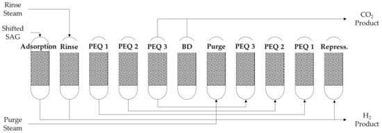 Sketch of a possible STEPWISE multi-bed layout with pre WGS reactor, H2 product repressurization, high-pressure (co-current) rinse, and low-pressure (countercurrent) purge steam supplies. For ease of graphical representation, possible pressure equalization lines are not shown.