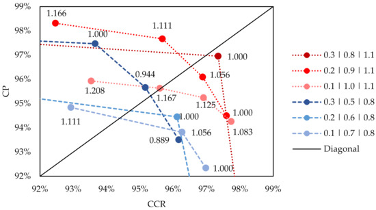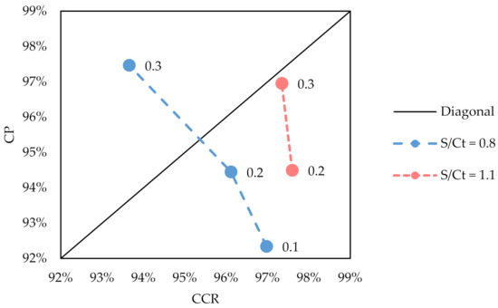 Although the diagonal solutions do not necessarily match those optimum solutions that best compromise between CCR and CP, maximize efficiency, or minimize costs, this approach is proposed to facilitate the identification and comparison of different operating points. It is therefore used to highlight how the studied parameters affect capture performances rather than to find their optimal design values.