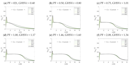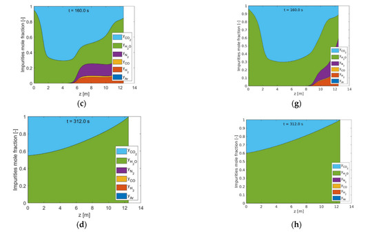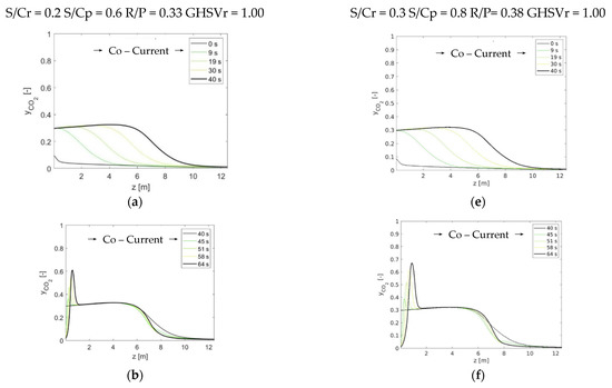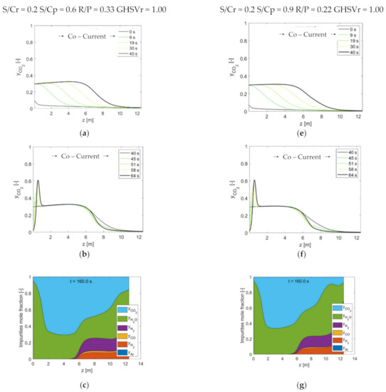 When the S/Ct is increased by mean of higher S/Cp, the CCR improves at every simulated point. This is because the greater amount of purge steam is more effective in recovery the CO2, as observed by other authors and presented in Figure 5d–h [12,24,37]. Conversely, the CP does not grow. Specifically, it drops from 97.47 to 96.95% at S/Cr of 0.3, while it is substantially unchanged at 94.45%, when the S/Cr is fixed at 0.2. This CP reduction is caused by a reduced progression of the CO2 front during the adsorption and rinse steps. The reduced progressions of these fronts are shown in Figure 5a–c and Figure 5b–d, for a S/Cr of 0.2. Accordingly, a greater fraction of impurities is then found in the column before the blow-down step (Figure 5c–g).