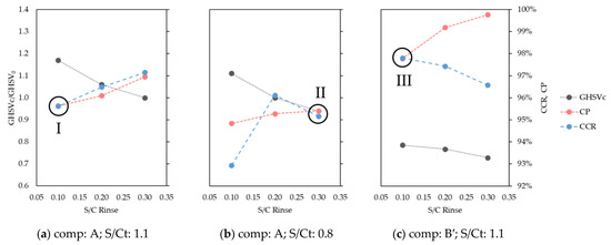 GHSVc, CCR, and CP results when both GHSVc and S/Cr are varied to identify the diagonal Pareto optimal solution. In (a), S/Ct is fixed at 1.1, while in (b) at 0.8. Both (a,b) are based on composition A. (c) shows results for a S/Ct of 1.1 with feed composition B′.