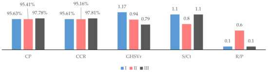 This observation implies that separation performance may be retained at a new GHSVc by manipulating the steam supply and its R/P ratio. This is demonstrated in Figure 9, where two operating points from Figure 8 are compared. These points, namely point I and II, differ in terms of GHSVc but show a comparable separation performance. Point II exhibits a lower GHSVc than point I, specifically by 20%. However, the separation performances remain close at ~95.5%. Only the supplied steam amounts are modified. Specifically, the R/P ratio is increased by ~5.4 times, from 0.11 to 0.60, while the S/Ct drops from 1.1 to 0.8. The retention of the separation performance is thereby achieved without changing any other process or cycle parameter, such as cycle time, as indicated by other authors [36].