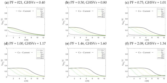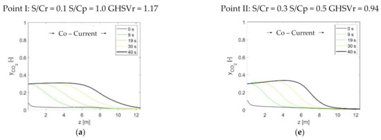 Typically, a lower GHSVc reduces the progression of the CO2 front during the adsorption step, improving the CCR at the expenses of CP [36,58]. However, by manipulating the R/P and S/Ct simultaneously, these effects can be balanced. As shown in Figure 10a–e, point II maintains a comparable CO2 front progression to point I regardless of lower GHSVc. Two factors determine this similarity, namely the greater rinse and reduced purge effectiveness of point II. In Figure 10b–f, point II shows a more intensive desorptive rinse than point I. The inlet H2O displaces a greater amount of CO2, while the CO2 slip is simultaneously reduced. This leads to a higher CCR and supports a greater progression of the CO2 front before pressure gets reduced. Additionally, it determines a greater CO2 gas fraction at the start of the blow down step, improving the CP (Figure 10c–g). However, the reduced purge intensity leaves a greater amount of CO2 in the column at the end of the regeneration step (Figure 10e–h). Although this causes both CCR and CP to reduce, it also contributes to maintain a high progression of the MTZ in the adsorption step.