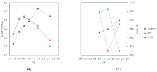 Finally, pressure variations were similarly analyzed in a third study on both BFG/BOFG and pure BOFG derived gases. Pressure and GHSVc are reported with dimensionless figures (i.e., PF in Equation (9) and GHSVr in Equation (11)) by using the reference values that are reported in Table 5.