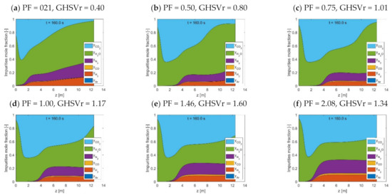 However, the CO2 front progression and width of the mass transfer zone (MTZ) do not vary significantly with a higher S/Ct, when both S/Cr and S/Cp are both changed, as shown in Figure 6a–e. The adsorptive rinse becomes actually more pronounced when the rinse-to-purge ratio (R/P) grows together with the S/Ct (Figure 6b–f). This leads to a greater progression of the CO2 front during the rinse step, even with a higher S/Cp value. Consequently, a reduced cumulative fraction of impurities is found at the end of the third PEQ step (Figure 6c–g). The CP is thereby enhanced to ~97%. Additionally, the CCR is also improved by the greater recovery of CO2 during the purge step (Figure 6d–h). Therefore, it can be concluded that higher CCR and CP can be attained by manipulating simultaneously the R/P and S/Ct ratios.