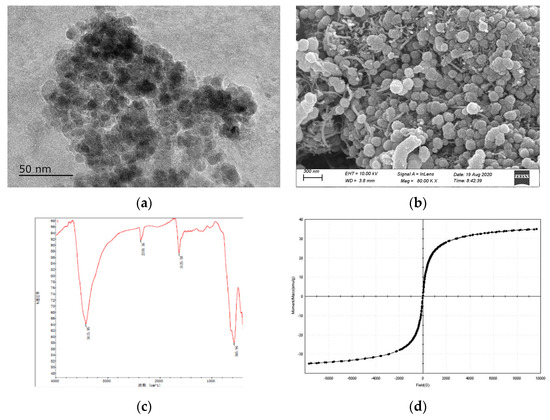 In this study, the structure of the resulting magnetic nanocomposites was first characterized by electron microscope. Scanning electron micrographs (SEMs) and transmission electron microscopy (TEM) results were obtained as shown in Figure 3. The SEM image (Figure 3a) revealed that the aminated magnetic carbon nanotube material was composed of uniform particles with the size distribution in the range of 10–20 nm, and Fe3O4 particles attached to the surface of the carbon nanotubes to make them magnetic (Figure 3b). Fourier transform infrared spectrum (FT-IR) of Fe3O4/NH2-MWCNTs is shown in Figure 3c. There are three strong adsorption bands located at 566 cm−1, and it is ascribed to the Fe–O–Fe stretching vibration of Fe3O4. The peaks appeared at 3416, 2359 and 1626 cm−1, which belonged to the stretching vibration of N–H, the stretching vibration of CH2 and the stretching vibration of the C–C bond, respectively. As shown in Figure 3d, the magnetization hysteresis loop of the material was S-like, which indicated that the composite was superparamagnetic. The saturation magnetization value of Fe3O4/NH2-MWCNTs was calculated to be 35 emu/g, which was sufficient to ensure the easy and quick separation of the compounds from solutions.