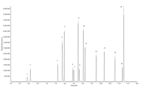 Total ions chromatogram of 16 kinds of synthetic cathinones with GC-MS. Peaks: (1) Cathinone; (2) MC; (3) 4-CEC; (4) 4-MPD; (5) NEH; (6) 4-CBC; (7) MDMC; (8) 4-MePPP; (9) MDEC; (10) 4-Cl-α-PPP; (11) 4-F-α-PHP; (12) 4-Cl-α-PVP; (13) 4-Cl-α-PHP; (14) MDPV; (15) MDPHP; (16) TH-PHP.