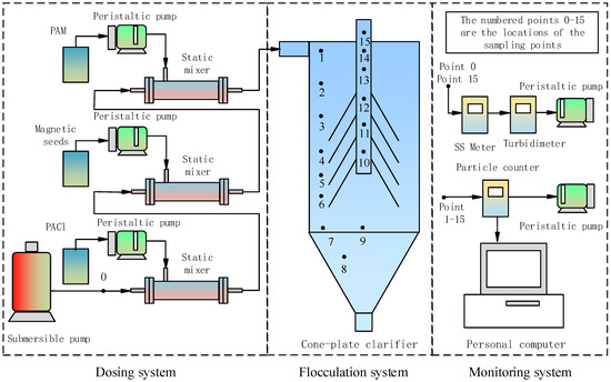 According to previous studies, in the present experiment, polyaluminum chloride (PACl) was used as the coagulant. Anionic polyacrylamide (PAM) with a molecular weight of 12 million was chosen as the flocculent to form colloidal aggregates. Fe3O4 with a mesh size of 200 was selected as the magnetic seed. The stock solutions were prepared by dissolving the reagents in a deionized solution. The dosage, concentration and addition order of the three chemicals were determined by the beaker test. The concentrations of PACl solutions and PAM solutions were 1% and 3‰, respectively. PACl was first added during the test, and its dosage was 60 mg/L. Then the magnetic seeds were added with a dosage of 40 mg/L. Finally, PAM was injected with a dosage of 6 mg/L. The flow rate of the peristaltic pump was between 0 and 2280 mL/min. The peristaltic pump flow rates were 60 mL/min, 8 mL/min and 20 mL/min for the addition of PACl, the magnetic seed and PAM, respectively.