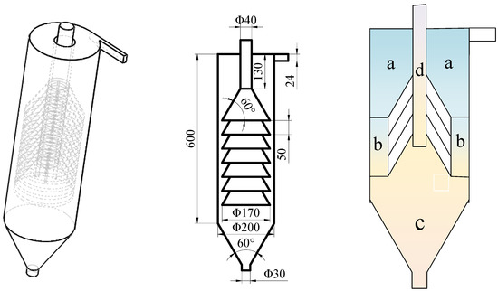 The flocculation system was composed of a cone-plate clarifier. The structure of the cone-plate clarifier is illustrated in Figure 2. The schematic diagram of the cone-plate clarifier is shown in Figure 3. It was composed of a cylindrical body, a conical part, a tangential feed inlet, a cone-plate, an exit pipe, an underflow port and an exit pipe. According to the flocculation stage, the cone plate clarifier was divided into four zones: The micro flocculation zone, flocs-growing zone, settlement zone and exit pipe zone. The flow rate of the cone-plate was 0.6 m3/h and the hydraulic retention time was 7.5 min.