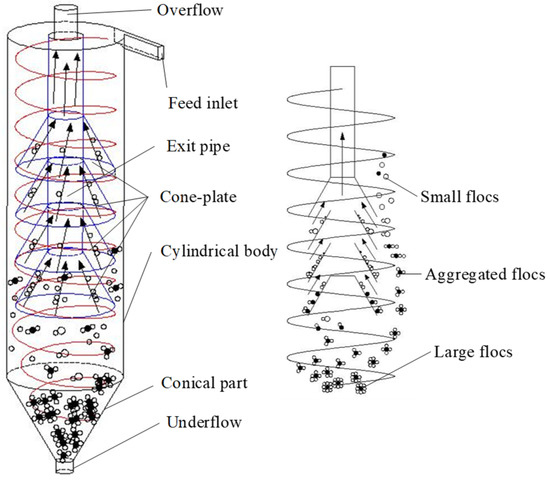 - Different structural parameters have different effects on the distribution of particles with different particle sizes. When the height of the cylinder was high enough, the flocs with a larger particle size moved away from the cone-plate under the action of centrifugal force and settled more easily under the action of gravity in the flocs-growing zone. Meanwhile, the settlement zone was less disturbed by the flow field, and the large flocs that had settled could not enter the exit pipe zone, which was beneficial to the settling of particles. It is worth noting that when the cylinder height was too high, it would take up more space.