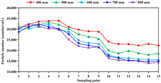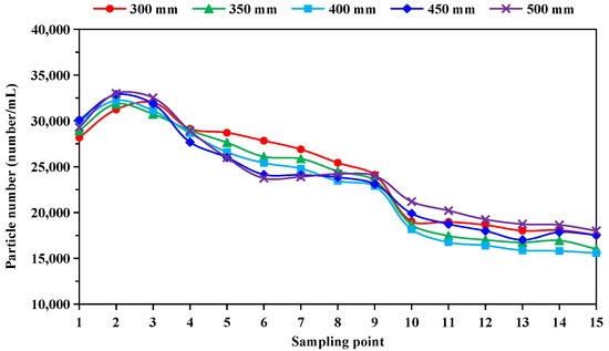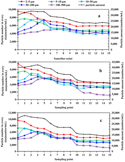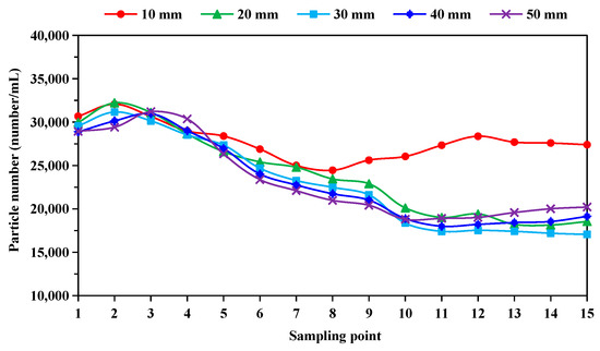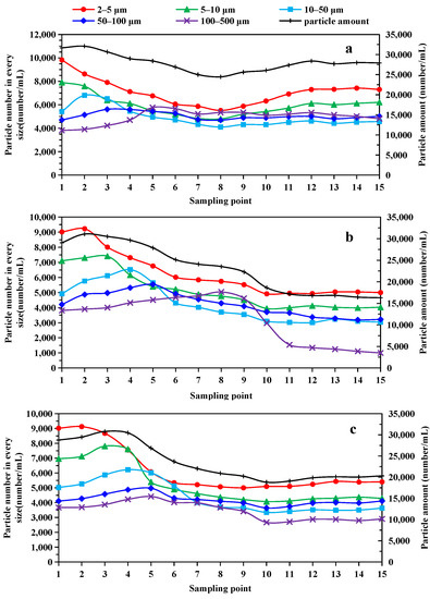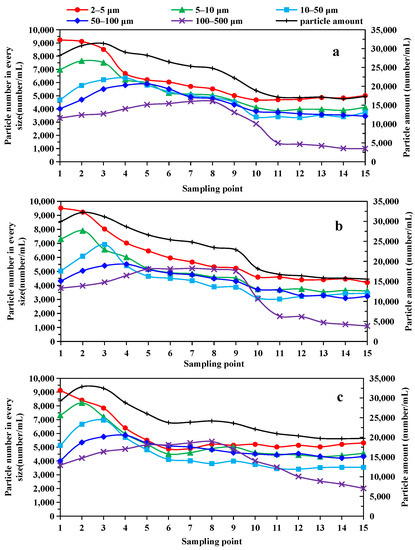 The curve of the number of 10–50 μm particles in Figure 5b reaches its maximum at sampling point 3. At sampling point 10, the particle number of each size decreases significantly, especially for the particles of 100–500 μm. The lowest number of particles was found at sampling point 15, with a total particle count of 15,566 mL−1.