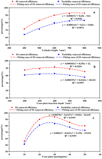 The SS and turbidity of the treated coal mine water were sampled and analyzed. The SS and turbidity removal efficiency were then calculated from the values of the raw coal mine water. The effects of cylinder height, cone-plate insertion depth and cone-plate spacing on SS and turbidity removal efficiency are shown in Figure 10a–c, respectively.