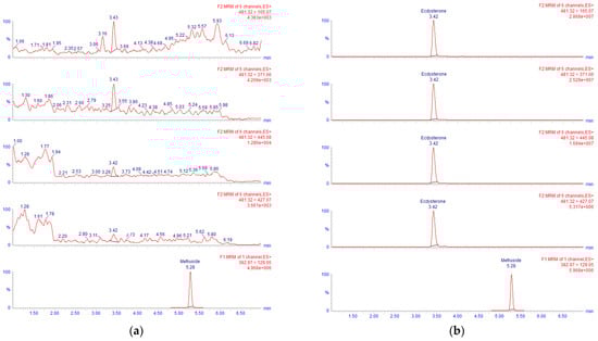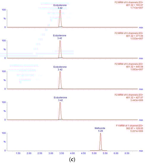The spinach sample was prepared according to the protocol described above. Again, the WADA technical document TD2021IDCR [8] was followed to confirm the identity of ecdysterone in this sample. Some results obtained in the analysis of the spinach sample are shown in Figure 3. The retention time (RT) for ecdysterone and mefruside was 3.40 min and 5.24 min, respectively, and the estimated concentration of ecdysterone was 10 µg/100g of spinach.