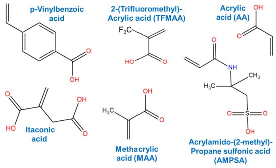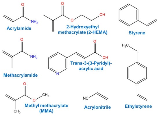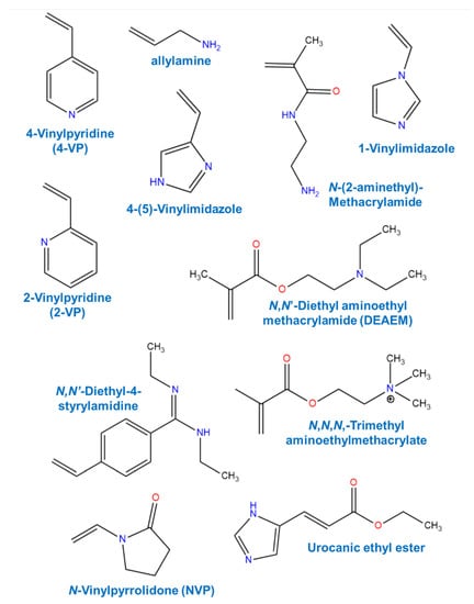 Among the most functional monomers used in the IIP synthesis is the methacrylic acid (MAA) [44,48,49,50,51,59], first proposed by Arshady and Mosbach in 1980 [31], whose electron donor is the atom of oxygen. Basic monomers such as 1-vinylimidazole (1-VID) and 4-vinylpyridine (4-VP) are also frequently used in the synthesis of IIP. However, the complex formed with the metal ion is via a nitrogen atom. Figure 2, Figure 3 and Figure 4 show the structure of the most important functional monomers classified as acids, basic, and neutral, respectively [62].