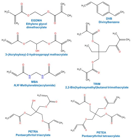 According to Cormak and Elorza [62], the crosslinking agent performs three functions in the synthesis of polymers, which correspond to controlling the morphology of the polymer; stabilizing the binding sites with ionic recognition capability; and conferring mechanical stability to the polymer matrix.