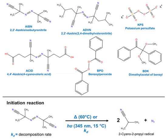 Figure 7 shows some initiators used in the synthesis of IIP and the representation of the production of 2-Cyano-2-propyl radical from 2,2′-azo-isobutyronitrile (AIBN), where the latter is the initiator commonly employed.