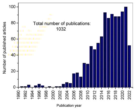 Number of published papers on IIP from 1991 to 2022. Web of Science: ion-imprinted polymer and ion imprinted polymer (Accessed in August 2022).