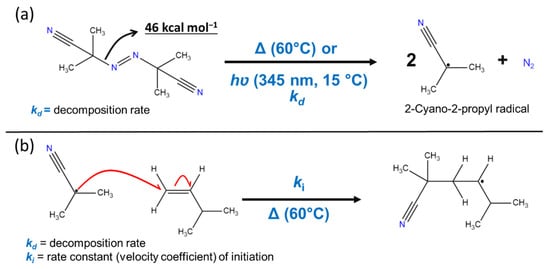 Mechanism of the initiation step in free-radical polyaddition: (a) homolytic decomposition; (b) free radical production that initiates the polymerization reaction.