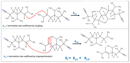 Finally, the termination step occurs when there is interruption of chain growth due to the disappearance of the active center due to: (a) coupling or combination of two active centers, forming a simple bond between the propagating species; (b) disproportionation, which consists of the intermolecular transfer of a hydrogen atom from one chain to another in growth, saturating one end and creating a double bond at the end of the other chain; (c) snatching of a hydrogen atom from any point in the chain, where the active center is transferred to compensate for the loss of this hydrogen, forming branches; (d) interaction of the free radical with other formed radicals or molecules present in the reaction medium, such as a solvent, initiator, impurities or molecular oxygen. The mechanism of the termination step in free radical-initiated polyaddition is shown in Figure 11.