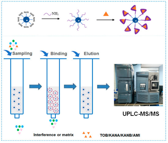 At present, the analysis of AGs is focused on the following three techniques: instrumental, immunoassay [5], and microbiological assays. Immunoassay and microbiological methods are relatively simple, but the detection time is long, the accuracy of the experiment is low, and the antibiotics with similar structures may interfere with the test results causing false positive results. Instrumental methods include high-performance liquid chromatography (HPLC) coupled to a UV detector [6,7], capillary electrophoresis coupled to tandem mass spectrometry [8], ultra-high-performance liquid chromatography coupled to tandem mass spectrometry (UPLC-MS) [9,10]. AGs are highly polar compounds with poor retention in traditional reverse phase liquid chromatography, and because of lack of chromophore and fluorophore [11], results for AGs cannot be detected directly by UV or fluorescence detectors unless dispensed by a derivative method [12]. However, such derivatives lead the HPLC instrument conditions more complex, and additional processing steps result in the loss of analytical substances, excessive reagents, and other uncertain factors in analytical results. UPLC-MS shows advantages in screening, identifying, and quantifying AGs due to its high accuracy and sensitivity. Due to the special properties of AGs, some sample pretreatment processes are needed before UPLC-MS detection. In the traditional pretreatment method-solid-phase extraction (SPE), poor recognition of the SPE column may lead to poor purification effect, poor detection sensitivity, and poor recovery caused by the influence of miscellaneous peaks in sample matrix [13]. In general, immunoaffinity columns (IAC) are also used for extraction and separation prior to sample analysis, where the target is identified by antigen–antibody interaction, showing superior performance in recognition specificity. However, as an important part of IAC, antibody synthesis is affected by many conditions, such as temperature, pH, ion environment, resulting in large differences between batches and poor stability. Additionally, AGs as small molecule semi-antigen, which cannot stimulate the body to produce corresponding antibodies, resulting in much more difficult for highly sensitive antibodies preparation.