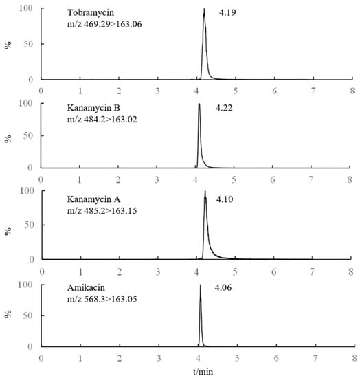 The retention time of AGs was longer with a high proportion of organic solvent in the mobile phase when analyzed by the Amide column. Therefore, the separation of AGs or impurities and AGs in the matrix could be realized by the use of a high proportion of organic phase in the initial stage of the gradient elution procedure, and gradually increase the proportion of the aqueous phase in the later stage. Thus, the influence of various mobile phases such as methanol-water, acetonitrile-water, methanol-formic acid solution, and acetonitrile-formic acid solution (the volume fraction of formic acid was 0.1–0.5%, respectively) on the AGs separation was investigated. The results showed that when methanol was used as the organic phase, the retention time and reproducibility of AGs were poor, which might be induced by the esterification of carboxyl on the surface of silica gel [26]. When only pure water was used as the aqueous phase, there was almost no peak in AGs. While obvious chromatographic peak could be observed, when formic acid was added in the aqueous phase. The addition of formic acid was helpful to the positive ionization of MS. Excellent peak shape could be observed when the volume fraction of formic acid was 0.2%. Furthermore, the response value and peak shape of the four AGs drugs were better when acetonitrile was used as the organic phase. Moreover, different concentrations of ammonium acetate (2.0-20.0 mM) in the aqueous phase were beneficial for the separation of AGs, and it was found that improved separation efficiency and relatively short retention time could be obtained with 5.0 mM ammonium acetate in the aqueous phase. Therefore, 0.2% formic acid (containing 5.0 mM ammonium acetate)–acetonitrile was used as the mobile phase. Under optimized conditions, the MRM chromatograms of the representative AGs are shown in Figure 2.