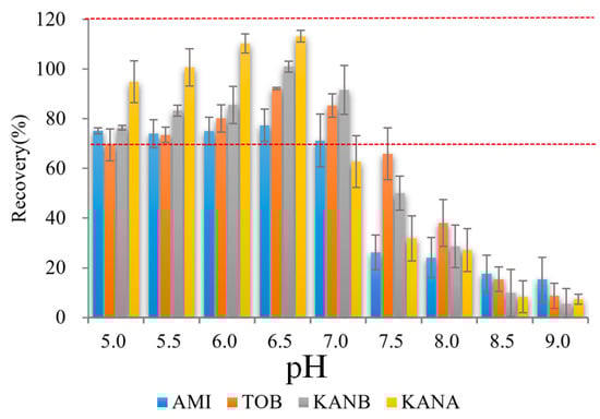 Binding buffer pH was important for AGs adsorption on AAC, which influenced the binding between the aptamer and AGs [27]. Thus, the effect of binding buffer pH on AAC adsorption was optimized. As shown in Figure 3, different pH of binding buffers (5.0, 5.5, 6.0, 6.5, 7.0, 7.5, 8.0, 8.5, 9.0) were prepared, and used as diluent to prepare 500.0 ng/mL mixed AGs solutions. After AGs loading, binding, and elution, the eluate was collected for UPLC-MS/MS detection. The recoveries of 4 AGs were the highest when the pH value was 6.5. Therefore, pH 6.5 was used as the best sample solution pH in this experiment.