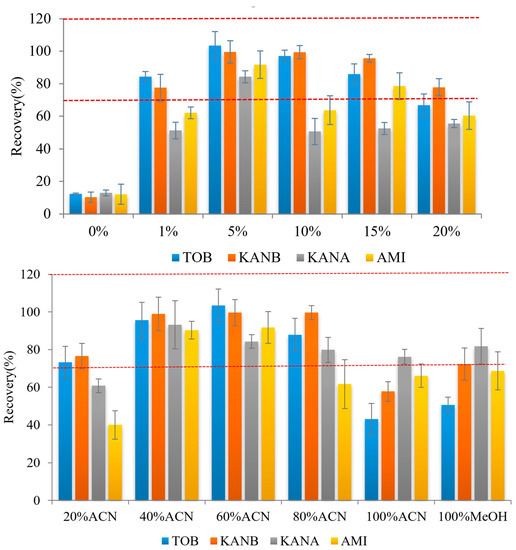 Ags are very soluble in water and insoluble in non-polar organic solvents. Direct use of organic solvents for elution leads to poor elution effects. Therefore, in this study, a different ratio of organic solvents with formic acid was added to adjust the eluent pH was optimized. Firstly, the ratio of formic acid was investigated, 1%, 5%, 10%, 15% and 20% formic acid were added into 40% acetonitrile as eluent for the AGs elution. The results showed that the target could not be completely eluted when the volume fraction of formic acid is too low (0% or 1%) or too high (10%, 15%, and 20%), and the four targets have the highest recoveries when the volume fraction of formic acid was 5% (Figure 4 top). Then the ratio of organic solvents was studied. Briefly, 1.0 mL 20%, 40%, 60%, 80%, 100% acetonitrile and 100% methanol with 5% formic acid were used as eluent, respectively. It was found that when the concentration of acetonitrile in the eluent is 40%, all four kinds of AGs can be eluted, and the recovery is higher than 90% (Figure 4 bottom). Therefore, acetonitrile:water:formic acid (40:55:5) was selected as the eluent in this experiment.