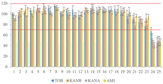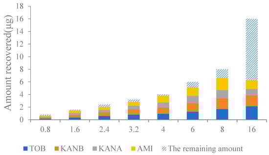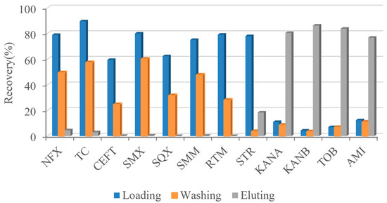 There are many kinds of antibiotics, which can be divided into β-lactam, macrolide, tetracycline, quinolone, aminoglycoside, and so on. Aminoglycoside antibiotics are glycoside antibiotics linked by amino sugars and amino cyclic alcohols through glycoside bonds. They have a common core structure (2-deoxystreptomycin cyclohexanol). Except for streptomycin, streptomycin contains streptavidin (cyclohexanol substituted with 2 amino groups). In order to investigate the specificity of AAC to AGs class, several representative antibiotics were loaded into AAC. Samples of 500 ng/mL norfloxacin (NFX), tetracycline (TC), cefoxitin (CEFT), sulfaparadimethoxine (SMX), sulfaquinoxazoline (SQX), sulfadimethoxine (SMM), roxithromycin (RTM), STR, KANA, KANB, TOB, and AMI were loaded into AAC, respectively. After loading, washing, and eluting, the eluting solutions were collected for the recovery determination of each component. As shown in Figure 7, all antibiotics except AGs were detected in the loading and washing part, that is, they could not be effectively captured by the AAC. STR did not retain in the AAC that well, because it did not have the mother nuclear structure recognized by aptamers. The other four kinds of AGs displayed high recoveries in the eluent. Therefore, it could be concluded that AAC has good specificity for AGs.