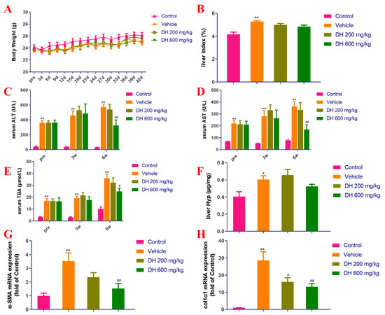 Biochemical markers of liver function are the key basis for determining the extent of liver injury. The blood serum concentrations of ALT, AST, and TBA in mice from the vehicle group were significantly higher in comparison with the control group (Figure 4C–E). On the contrary, the blood serum concentrations of these biochemical markers in the DH (600 mg/kg) groups were found to be considerably lower after 6 weeks of administration but did not affect liver Hyp (Figure 4C–F).