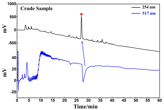 Analytical chromatogram on a 7-X10 analytical column and DPPH inhibitory activity profile of the extract of the ethyl acetate extraction of D. heterophyllum. Antioxidant peak marked with red heart. Conditions for HPLC1: mobile phase A: 0.1% v/v formic acid in water, B: MeOH; gradient elution: 0–60 min, 0–100% B; monitoring wavelength: 210 nm; flow rate: 1.0 mL/min; injection volume: 5 μL; column temperature: 30 °C. Conditions for HPLC2: monitoring wavelength: 517 nm; DPPH solution flow rate: 0.8 mL/min.