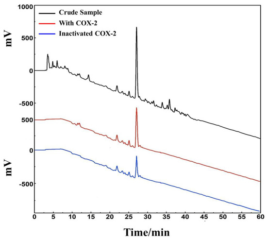 An affinity ultrafiltration-HPLC chromatogram for potential COX-2 ligands present in the ethyl acetate extraction of D. heterophyllum. The black, red, and blue lines, respectively, correspond to the HPLC chromatograms of the ethyl acetate extraction of D. heterophyllum without COX-2, with activated COX-2, and with inactivated COX-2. Conditions: mobile phase A: 0.1% v/v formic acid in water, B: MeOH; gradient elution: 0–60 min, 0–100% B; flow rate: 1.0 mL/min; monitoring wavelength: 210 nm; injection volume: 2 μL; column temperature: 30 °C.
