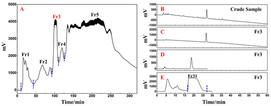The following phase involved the fast and efficient preparative separation of the primary functional component using medium- and high-pressure liquid chromatography in accordance with the activity-oriented results. The ethyl acetate extraction of D. heterophyllum contained a massive quantity of chlorophyll and lipophilic compounds, which were easily adsorbed on the stationary stage of the preparative column, causing column contamination and therefore had to be removed by pretreatment before further preparative separation experiments. MCI GEL® CHP20P packing is stable and can achieve good reproducibility for target compounds during purification [34,35]. Using it as a stationary phase for medium-pressure liquid chromatography can achieve high resolution for sample enrichment and high product recovery. In this view, 90.00 g of silica mix sample to a small medium-pressure tower (49 × 100 mm) was attached to a medium-pressure column packed with MCI GEL® CHP20P for dry loading sample preparation. The prepared enrichment chromatogram is shown in Figure 8A. Five fractions (Fr1, Fr2, Fr3, Fr4, and Fr5) were gathered after three repeated cycles using methanol–water as an eluent.