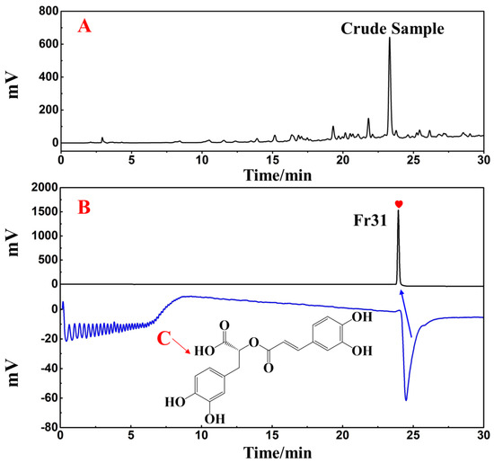 Purity and activity analysis comparison figures of the isolated main component Fr31 (A,B) on the SunFire analytical column. (C) is the chemical structure of the isolated compound. Antioxidant peak marked with red heart. Conditions: 0.1% formic acid in water, B: MeOH; gradient: 0–30 min, 10–90% B; monitoring wavelength: 210 nm; flow rate: 1.0 mL/min; injection volume: 1 μL; column temperature: 30 °C.