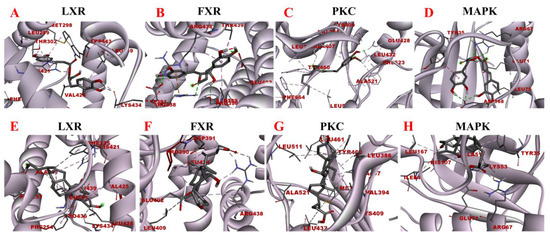 Molecular docking models of rosmarinic acid and obeticholic acid binding to LXR, FXR, PKC, and MAPK. (A–D) correspond to the binding models of rosmarinic acid with LXR, FXR, PKC, and MAPK, respectively. (E–H) correspond to the binding models of obeticholic acid with LXR, FXR, PKC, and MAPK, respectively.