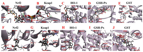 Molecular docking analysis of rosmarinic acid and obeticholic acid binding to Nrf2, Keap1, HO-1, GSH-Px, and GST. (A–E) correspond to the binding models of rosmarinic acid with Nrf2, Keap1, HO-1, GSH-Px and GST, respectively. (F–J) correspond to the binding models of obeticholic acid with Nrf2, Keap1, HO-1, GSH-Px, and GST, respectively.