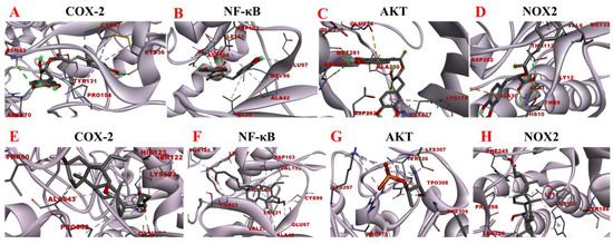 Intermolecular interactions between rosmarinic acid and COX-2, NF-κB, AKT, and NOX2.