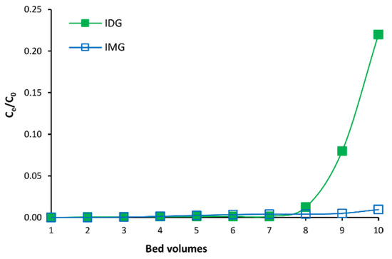 Dynamic breakthrough curves of Cyclopia subternata phenolic compounds on XAD 1180N macroporous resin at 2 BV/h in the small-scale column. Abbreviations: IDG, 3-β-D-glucopyranosyl-4-O-β-D-glucopyranosyliriflophenone; IMG, 3-β-D-glucopyranosyliriflophenone.
