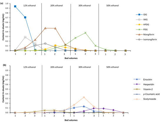Dynamic desorption curves of Cyclopia subternata benzophenones, dihydrochalcones and xanthones (a) and flavanones, flavones and a phenolic acid (b) using different concentrations of ethanol solutions in the small-scale column. Abbreviations: IDG, 3-β-D-glucopyranosyl-4-O-β-D-glucopyranosyliriflophenone; IMG, 3-β-D-glucopyranosyliriflophenone; HPDG, 3′,5′-di-β-D-glucopyranosyl-3-hydroxyphloretin; PDG, 3′,5′-di-β-D-glucopyranosylphloretin.