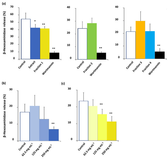Only the extract (p < 0.05) and fraction 1 (p < 0.01) were effective to inhibit mast cell degranulation as indicated by the decrease in the release of β-hexosaminidase in the RBL-2H3 cell model (Figure 5). Fraction 1 dose-dependently inhibited β-hexosaminidase release, but the extract was only significantly effective (p < 0.05) at 250 µg/mL.