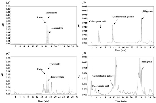 Analysis of Camellia japonica extracts by High Performance Liquid Chromatography (HPLC) (A,B): standard; (C,D): sample.
