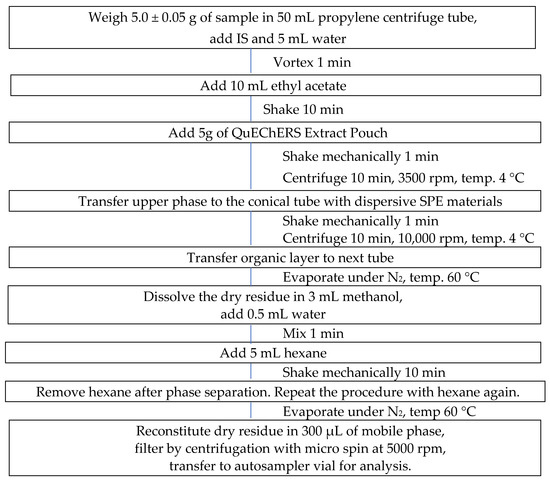 The content of the tube was mechanically shaken for 1 min and centrifuged for 10 min at 10,000 rpm and at a temperature of 4 °C. The organic layer was transferred to the next tube and evaporated under a nitrogen current at a temperature of 60 °C. The dry residue was dissolved in 3 mL of methanol, and 0.5 mL of water was added and mixed for 1 min. To the tube, 5 mL of hexane was added and mechanically shaken for 10 min; after phase separation, hexane was removed. The procedure with hexane was repeated.
