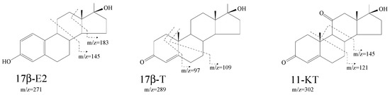 The product ion mass spectrum of 17β-T, 11-KT and 17β-E2 and corresponding IS are presented in Table 2. The schemes of proposed fragmentation of 17β-E2, 17β-T and 11-KT are presented in Figure 3.