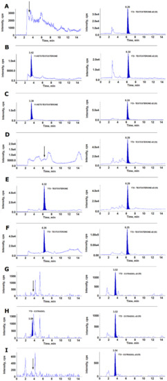 Ion chromatogram from the analysis of a male gonad sample: (A)—blank sample for 11-KT; (B)—sample spiked with 11-KT to the concentration of 5 ng/g; (C)—sample with 11-KT at a concentration of 23.67 ng/g; (D)—blank sample for 17β-T; (E)—sample spiked with 17β-T to a concentration of 1 ng/g; (F)—sample with 17β-T at a concentration of 0.57 ng/g; (G)—blank sample for 17β-E2; (H)—sample spiked with 17β-E2 to a concentration of 1 ng/g; (I)—sample tested with no 17β-E2.